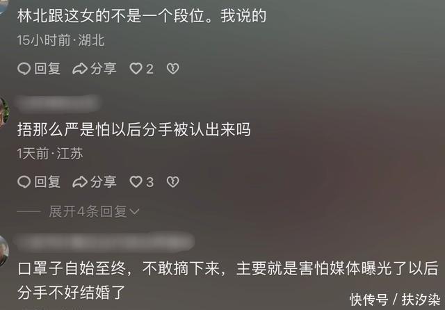 压力 女友带来家乡辣味特产,林北为她戴上自制花环,两人牵手游览景区,面对镜头,女友表示开心。 当网友讨论女友戴着口罩不愿露面时,林北就解释,是他希望女友能自由自在地生活。 但还是有人质疑他女友戴着口罩,是对他们感情的不自信,甚至有人对她女友的感情做出种种分析。