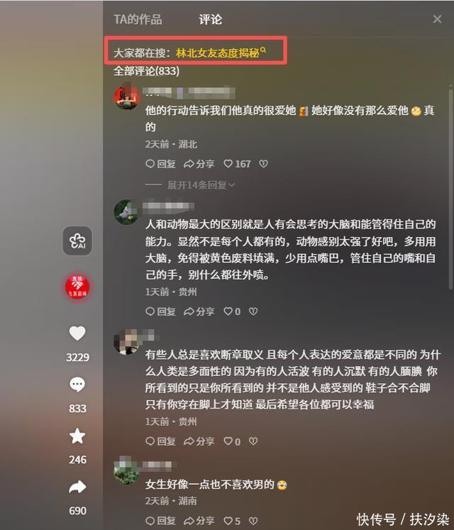 一线吃瓜菌 编辑| 一线吃瓜菌 前言 荒野求生林北“深情人设”已经立住,他和女友之间的互动非常有爱,可他们刚见面2天,他和女友的感情就遭到各种恶意揣测。 他和女友近况怎么样?为什么有人不看好他的恋情呢?