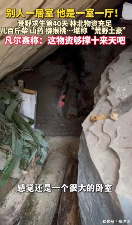 处境 林北表面维持着没心没肺没烦恼的人设,玩心太重,不执着冠军,实际上身心已经临近极限。 他囤积的2吨干柴、80斤野生猕猴桃、10多斤山药,理论上可以制程10天以上。 林北利用两块巨石搭建的天然石洞,里面放着竹床和熏肉架,防风保暖效果也比大部分选手要明显。